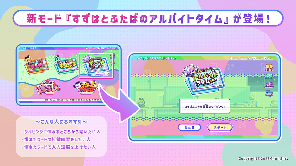 「めざせ!プロタイピングゲーマー」、「ゲーム業界 就活チャレンジ」、「すずはとふたばとアルバイトタイム」、「スコアアタック」の4モードに、